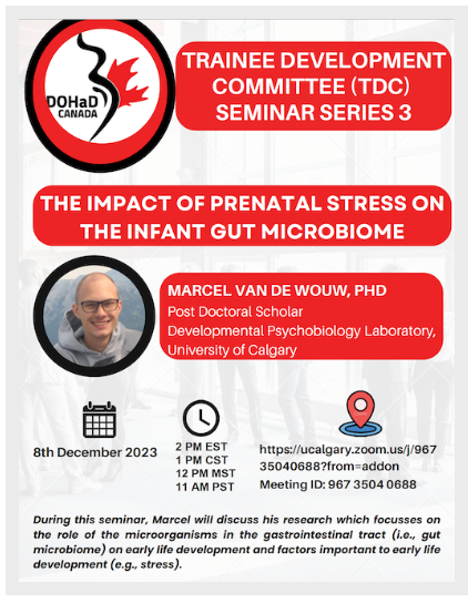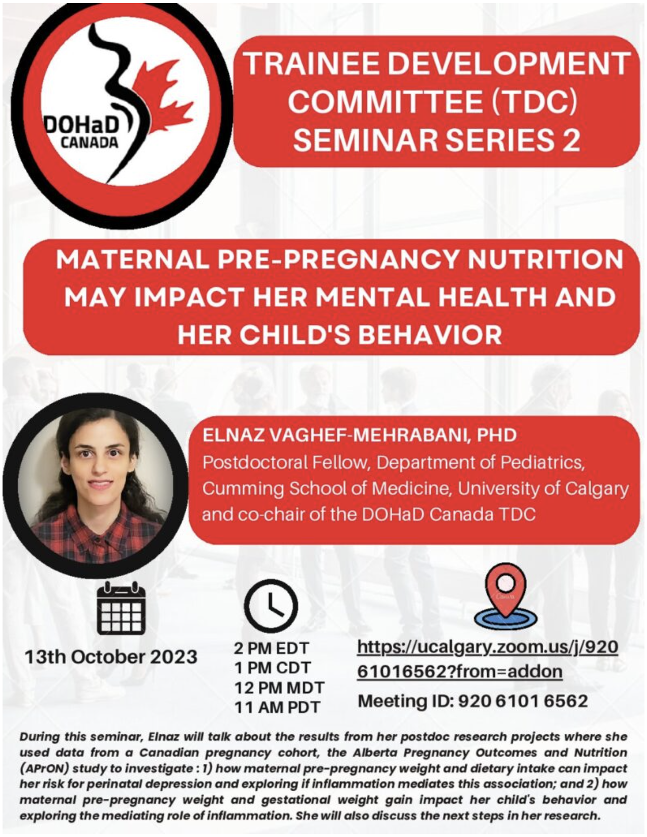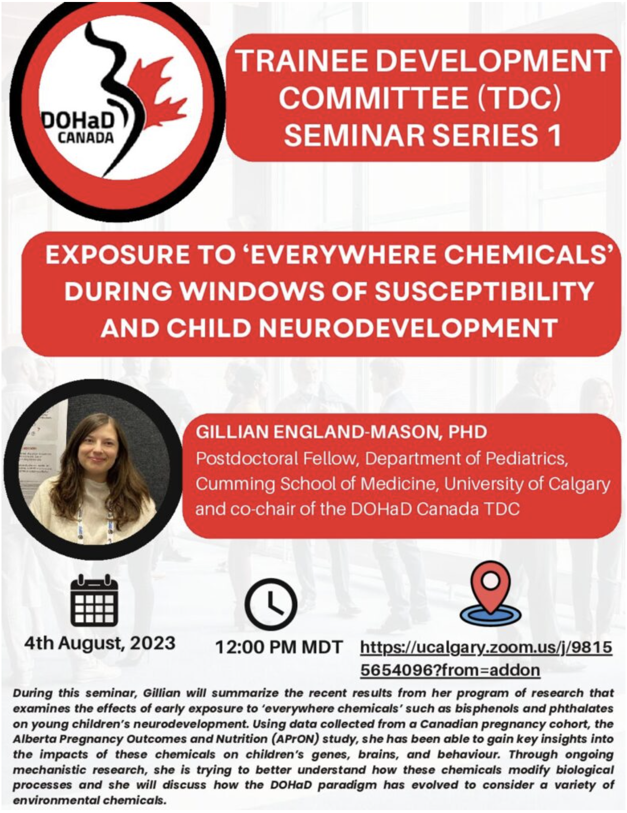 We are excited to invite you to attend the joint seminar series, “Trainee Tuesday!” led by trainee representatives of DOHaD Canada and US DOHaD societies. These 30-minute seminars are held virtually every other month and include a 15-mintes presentation and a 15-minutes Q&A period. They are designed to be a friendly space for you trainees to share your research at any stage of its development (from initial literature search to published work!) with your peers and PIs across North America and get feedback. Please let us know at communications@dohad.ca if you are interested in presenting at one of these sessions!